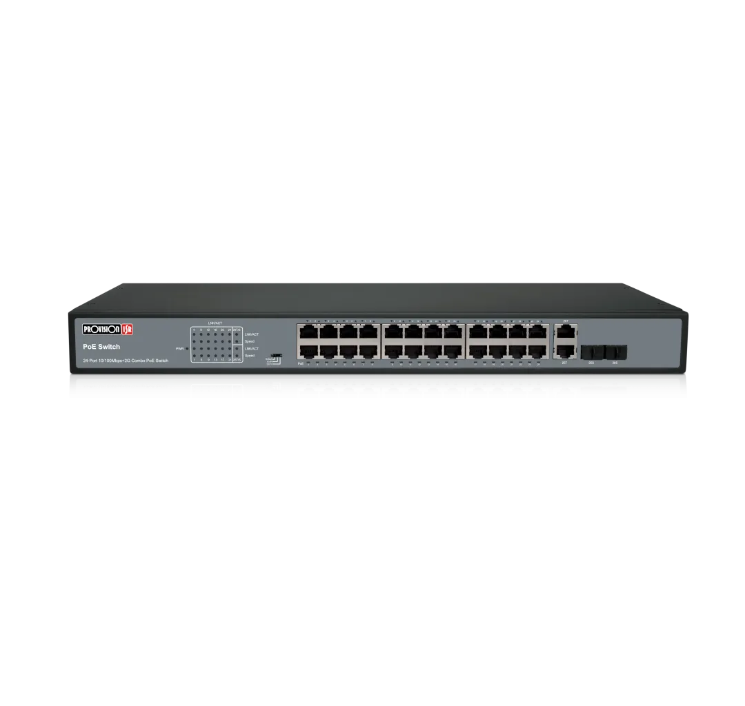 “PoES- 24370C+2Combo”    is a 10/100 24-port PoE + 2G combo ethernet switch. The switch auto-detects connected IEEE802.3af/at compliant Powered Devices (PD) and supplies power to these devices. The PoE objective is to deploy independent power to places with no power source and outlets. CCTV mode allows connecting a camera up to a 250m distance.